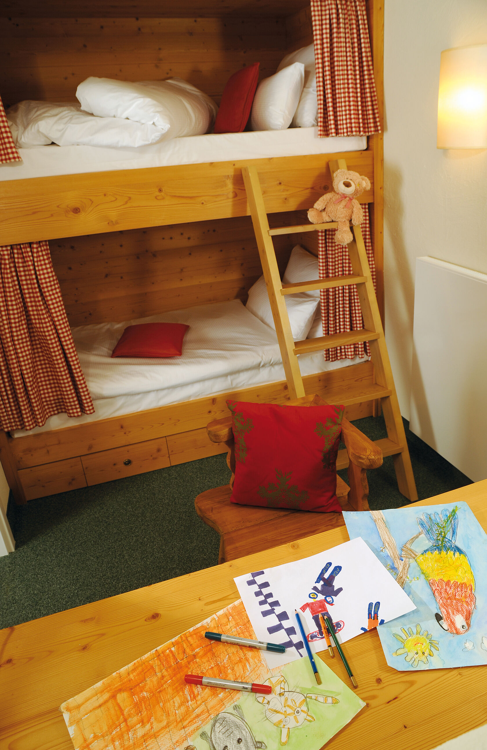 Viel Raum mit Hüttenatmosphäre: unsere 4 Familiensuiten erinnern an die gemütlichen Berghütten in den Alpen. Rustikales Mobiliar und klassische Wanddekorationen zieren die großzügigen Räume. Die eigene Hütte für die Kleinen mit Hochbett, der zweite Waschtisch für die Kinder im Bad und die Sitzecke für die ganze Familie sind nur einige Highlights beim Kurztrip in die Berge.