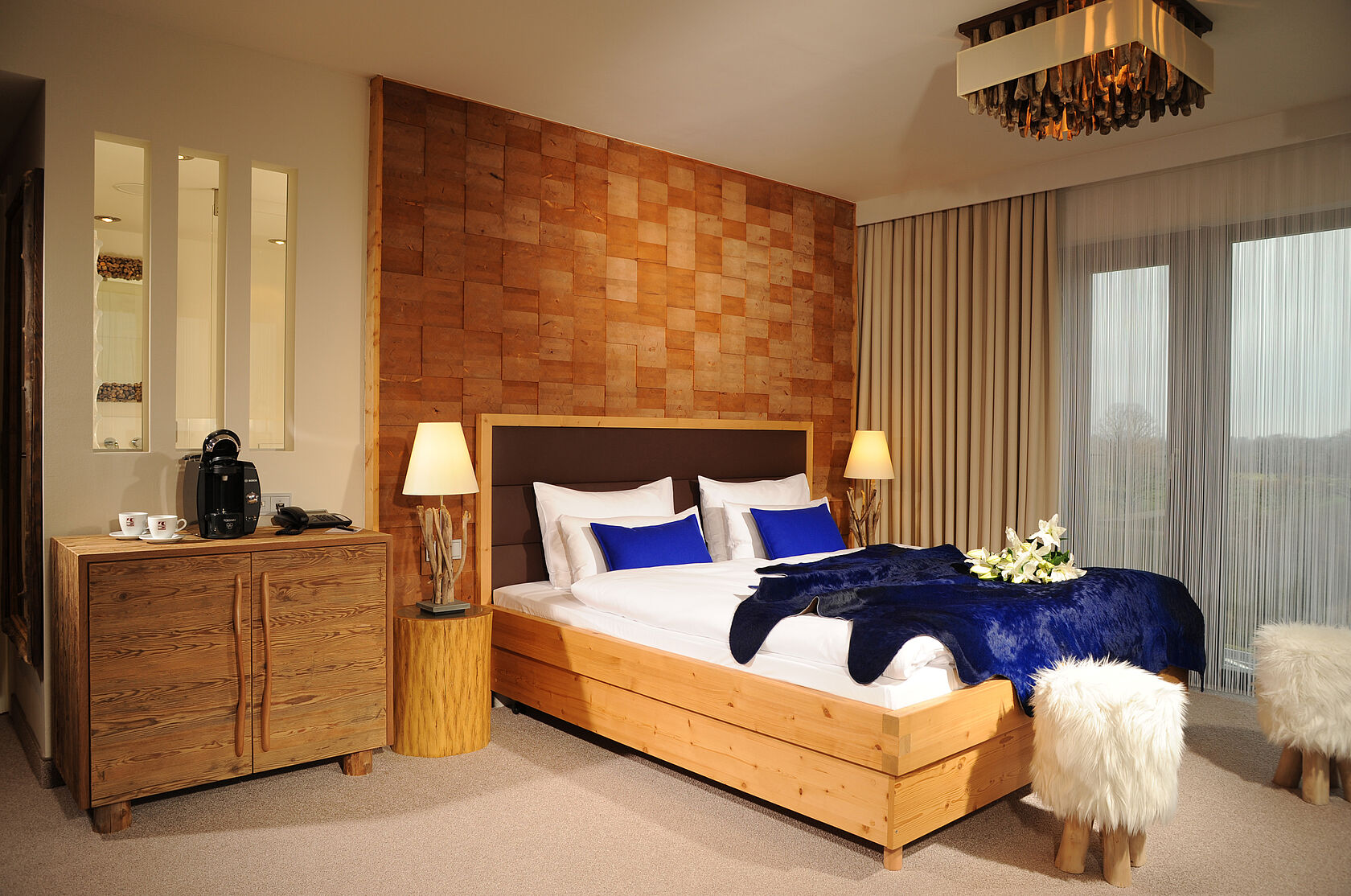 Zeit zum Ausspannen, Ausruhen und Träumen verspricht unser Themenzimmer AlpenArt. Mit Schwemmhölzern und Kuhfellen zeigt sich das Zimmer modern und ausgefallen, aber dennoch typisch alpin und gemütlich.